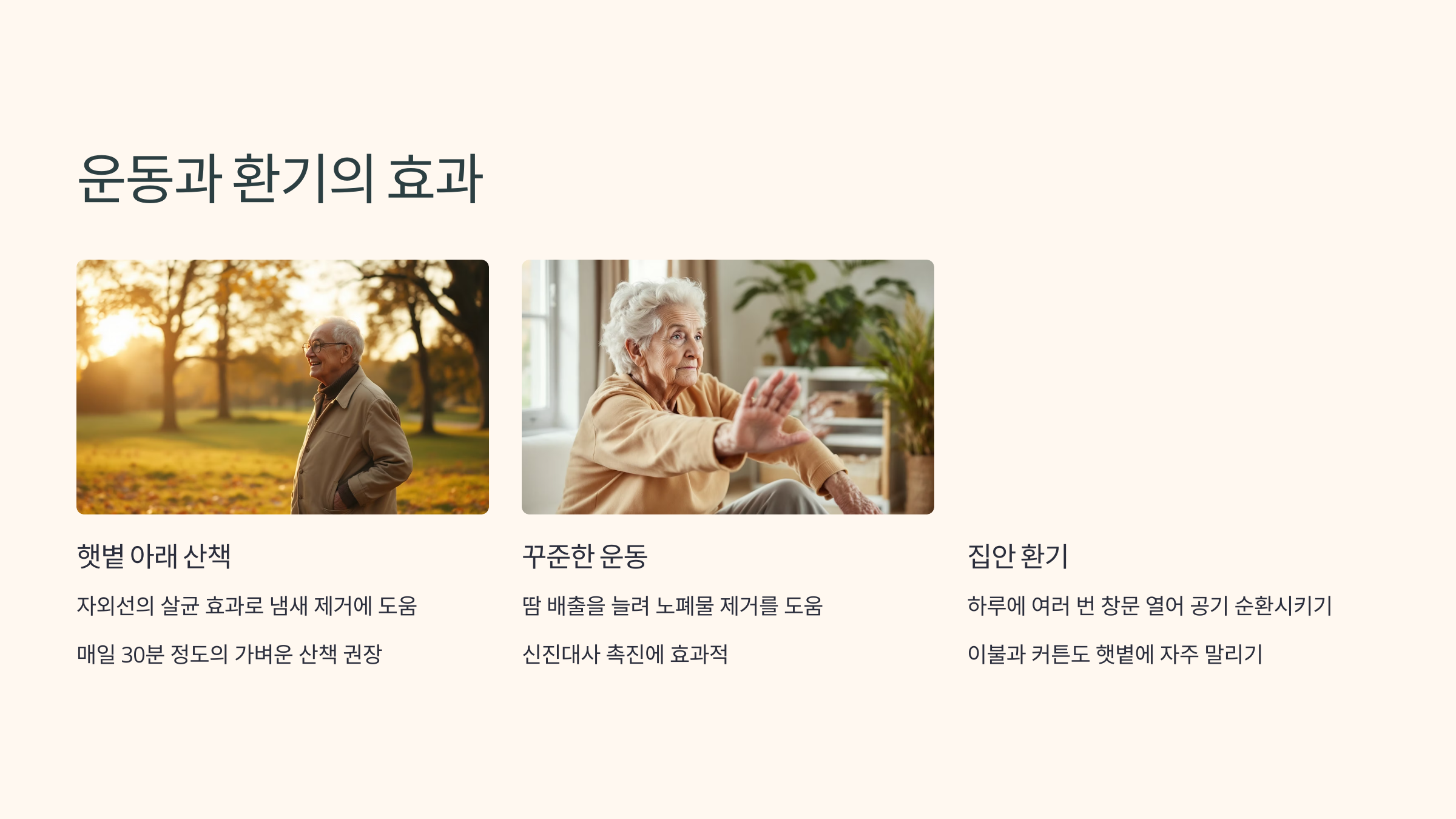 적당한 운동은 땀 배출을 늘려 노폐물 제거를 돕고, 햇빛의 자외선은 살균 효과가 있어 냄새 제거에 도움이 됩니다. 매일 30분 정도 산책하거나 가벼운 운동을 실천해보세요.