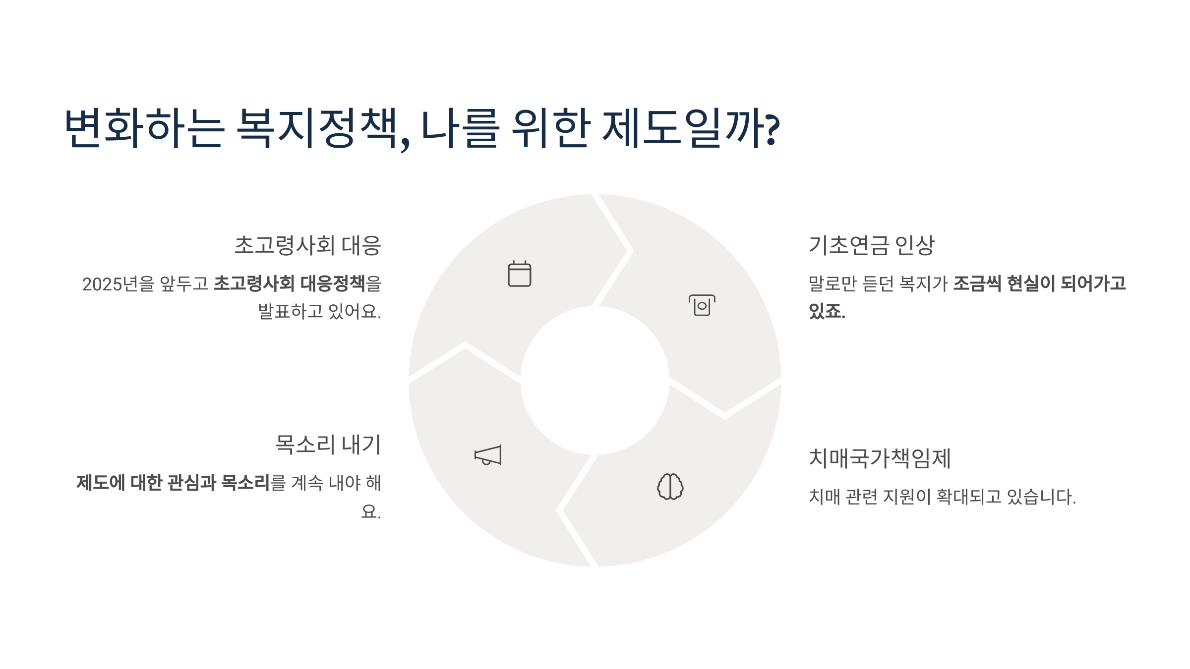 바로 ‘연금’, ‘장기요양보험’, ‘복지정책’입니다.