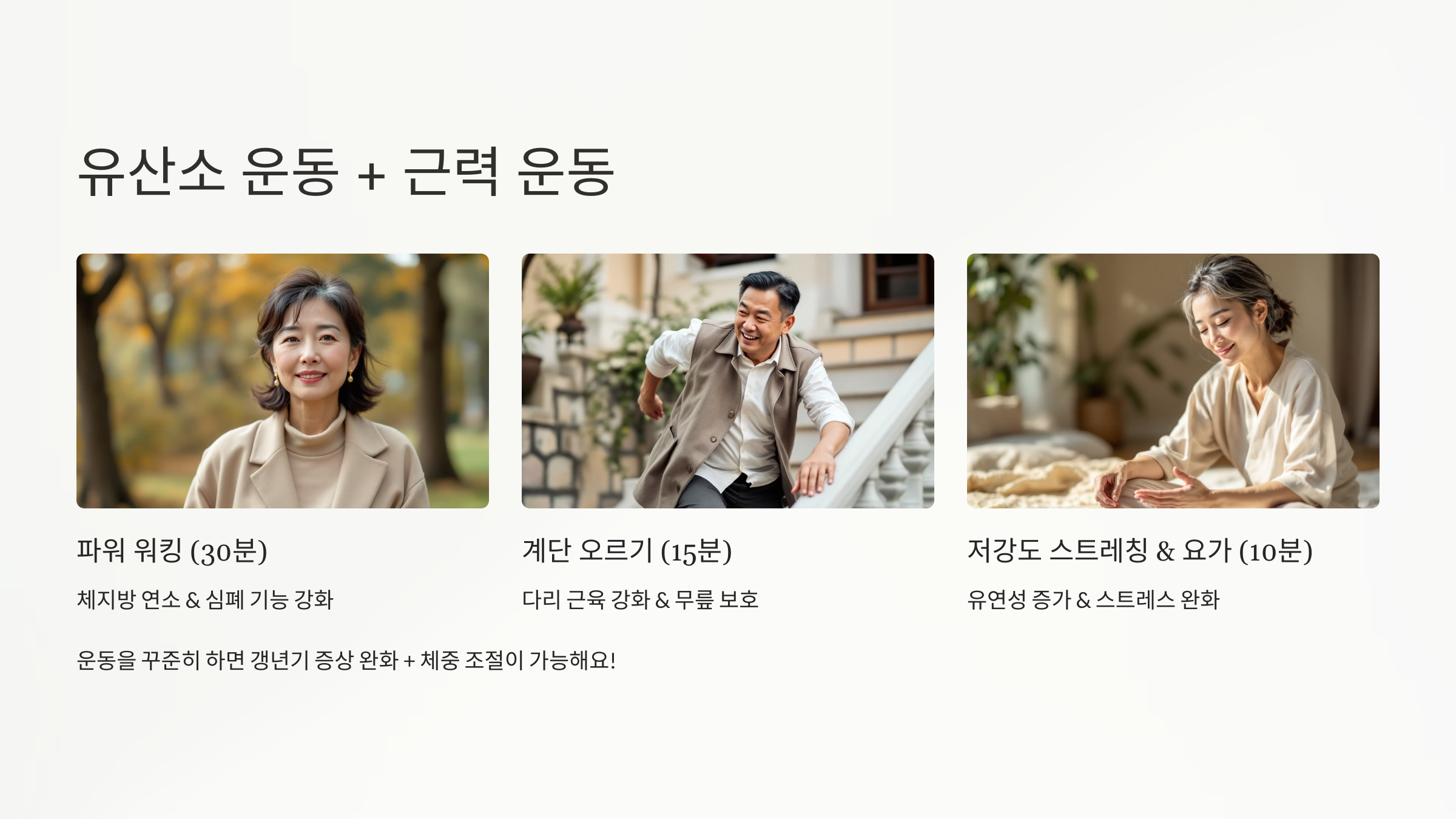 👉 운동과 식습관을 함께 관리하면 갱년기 증상을 효과적으로 완화할 수 있어요! 😊