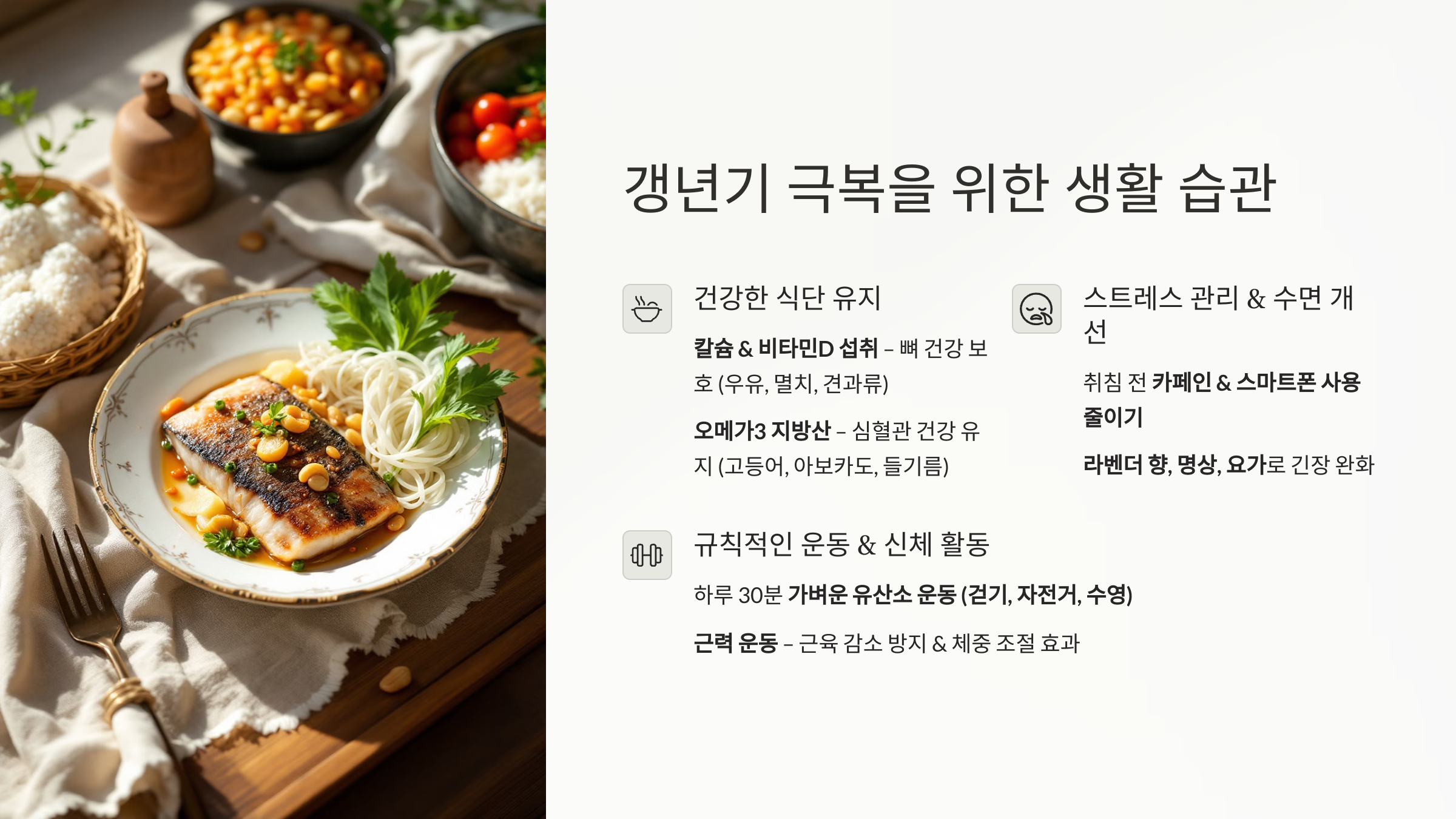 ✅ 갱년기 증상 완화 – 올바른 식단 + 스트레스 관리 + 규칙적인 운동