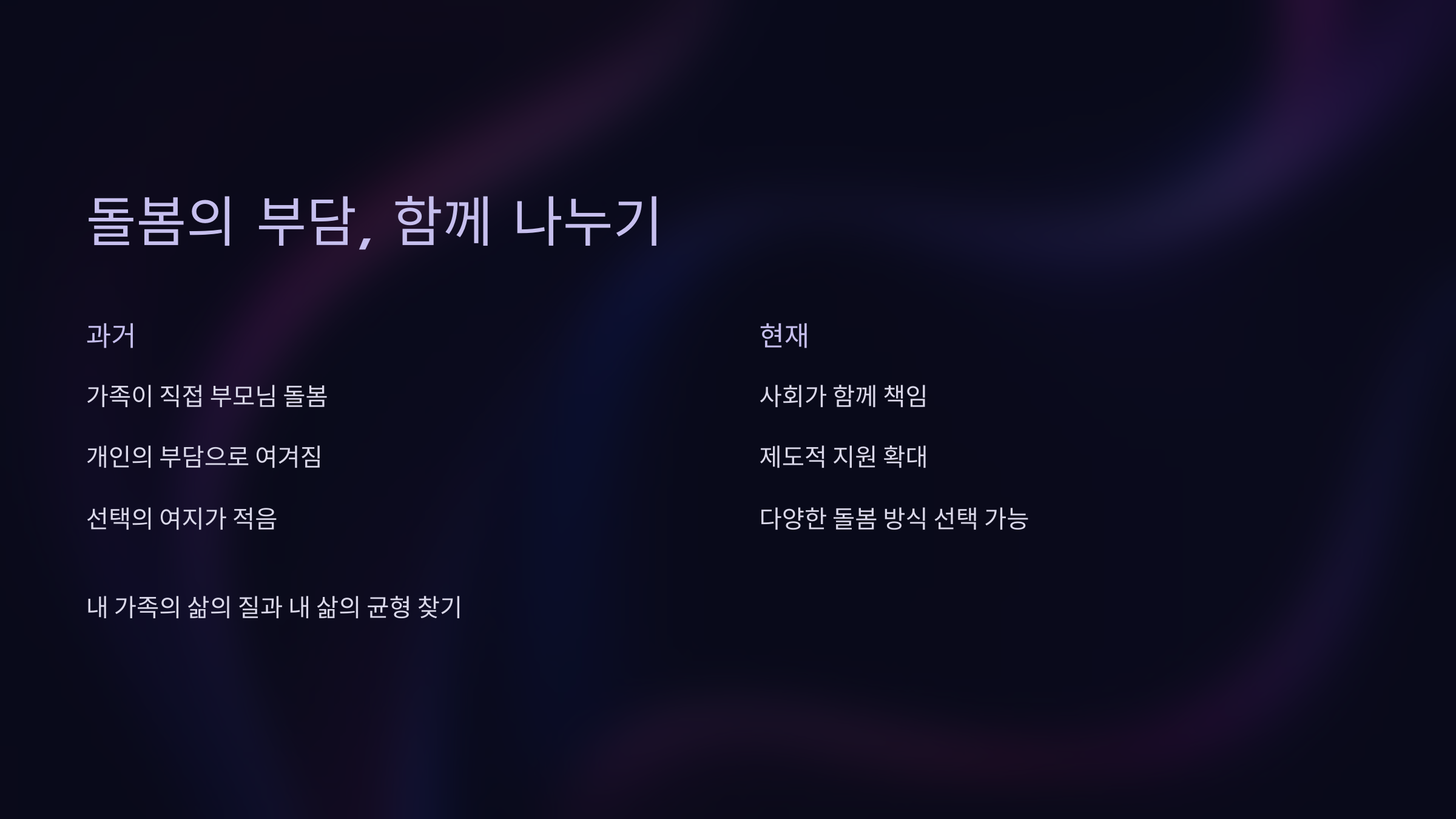 이제는 가족, 요양보호사, 간병인 등 다양한 주체가 함께 돌봄을 나누는 것이 새로운 트렌드입니다.