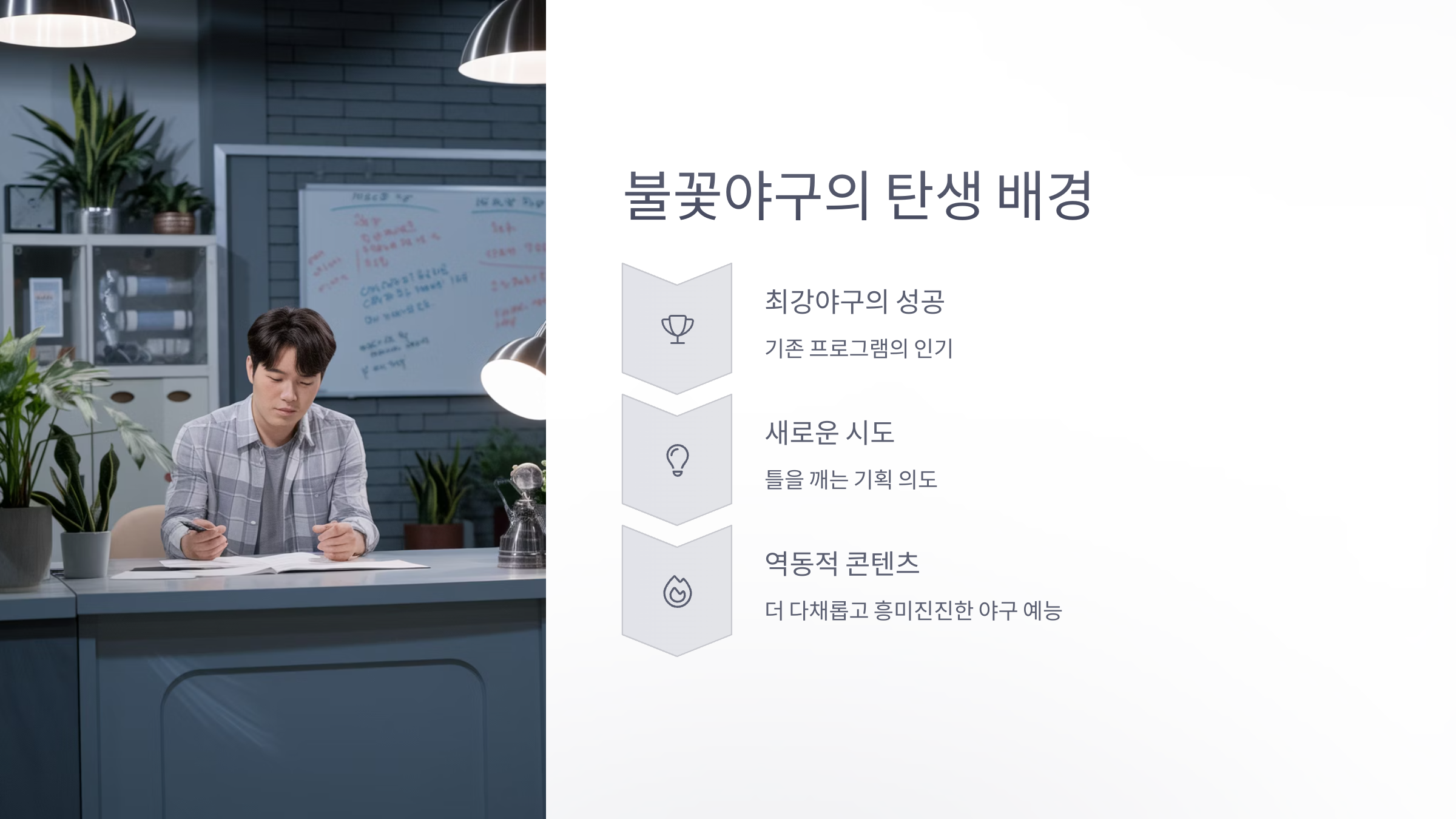 장시원 PD는 '최강야구'의 성공 이후, 새로운 야구 예능의 필요성을 느끼고 '불꽃야구'를 기획하게 되었습니다. 이 프로그램은 기존의 틀을 깨고, 더욱 다채롭고 역동적인 야구 콘텐츠를 제공할 예정입니다.