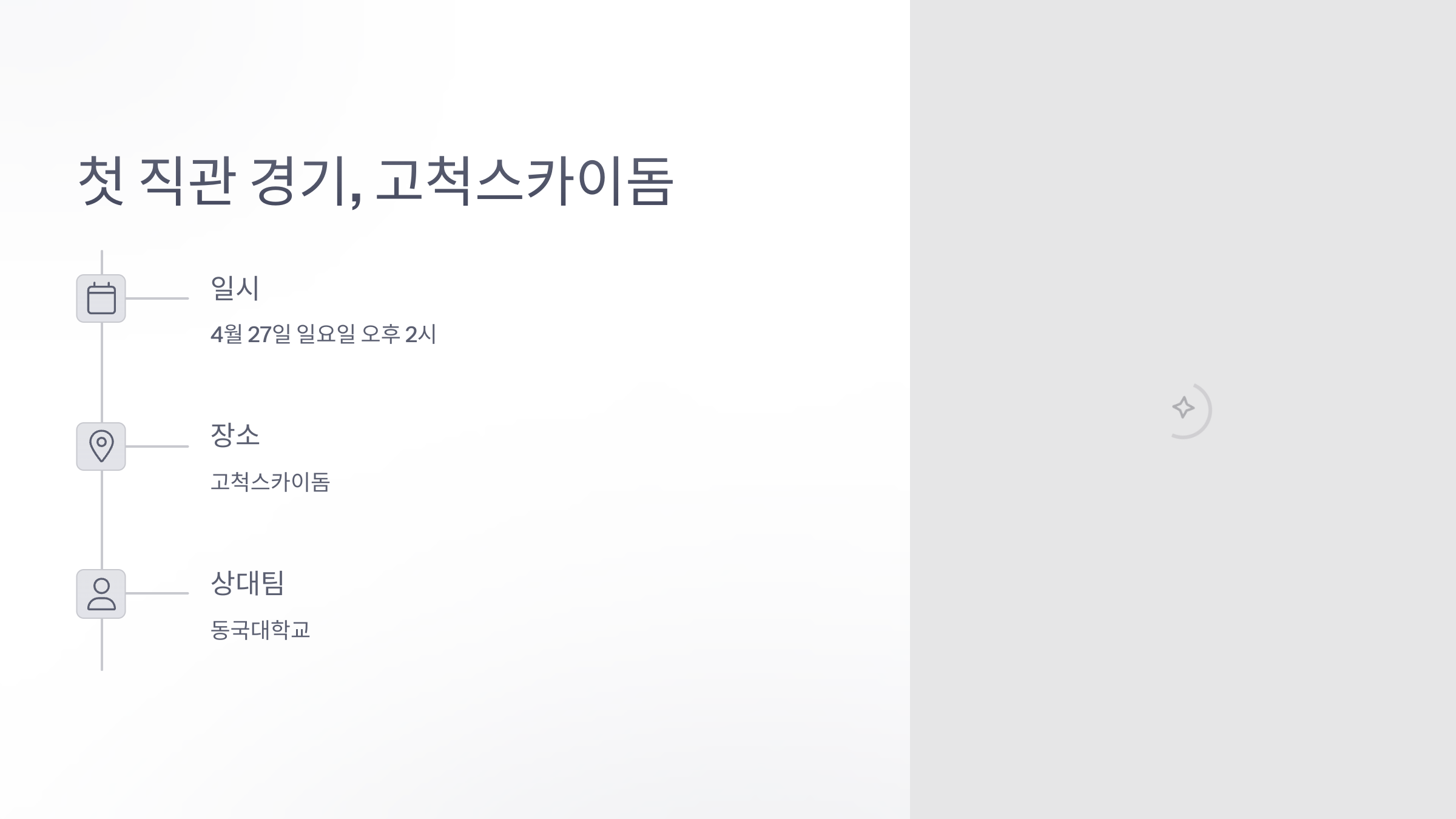 '불꽃 파이터즈'의 첫 공식 경기는 오는 4월 27일 일요일 오후 2시, 고척스카이돔에서 동국대학교와의 대결로 펼쳐집니다. 이 경기는 팬들에게 새로운 야구 예능의 매력을 선보일 중요한 무대가 될 것입니다.