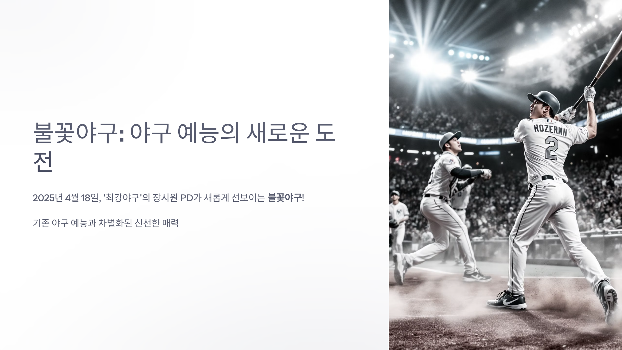 2025년 4월 18일, 야구 예능 팬들의 이목을 집중시키는 새로운 프로그램이 등장했습니다. 바로 '최강야구'의 장시원 PD가 새롭게 선보이는 '불꽃야구'입니다. 이 프로그램은 기존의 '최강야구'와는 다른 매력으로 시청자들을 사로잡을 준비를 하고 있습니다.