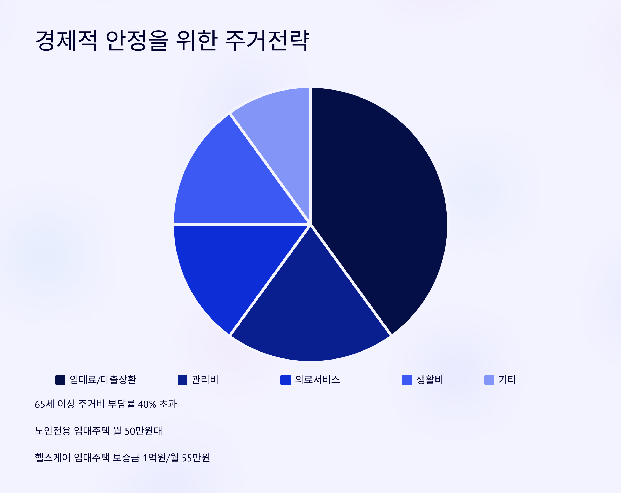 65세 이상 주거비 부담률이 40%를 넘어서는 현실[5][8]. 이에 맞춰 '노인전용 임대주택'이 각광받으며, 월 50만원 대 공공임대와 민간서비스형 주택이 쏟아져 나옵니다[2][4]. 서울 강남구의 '헬스케어 임대주택'은 보증금 1억원 대비 월 55만원에 의료상담·건강검진을 포함한 패키지를 제공합니다[5][8].