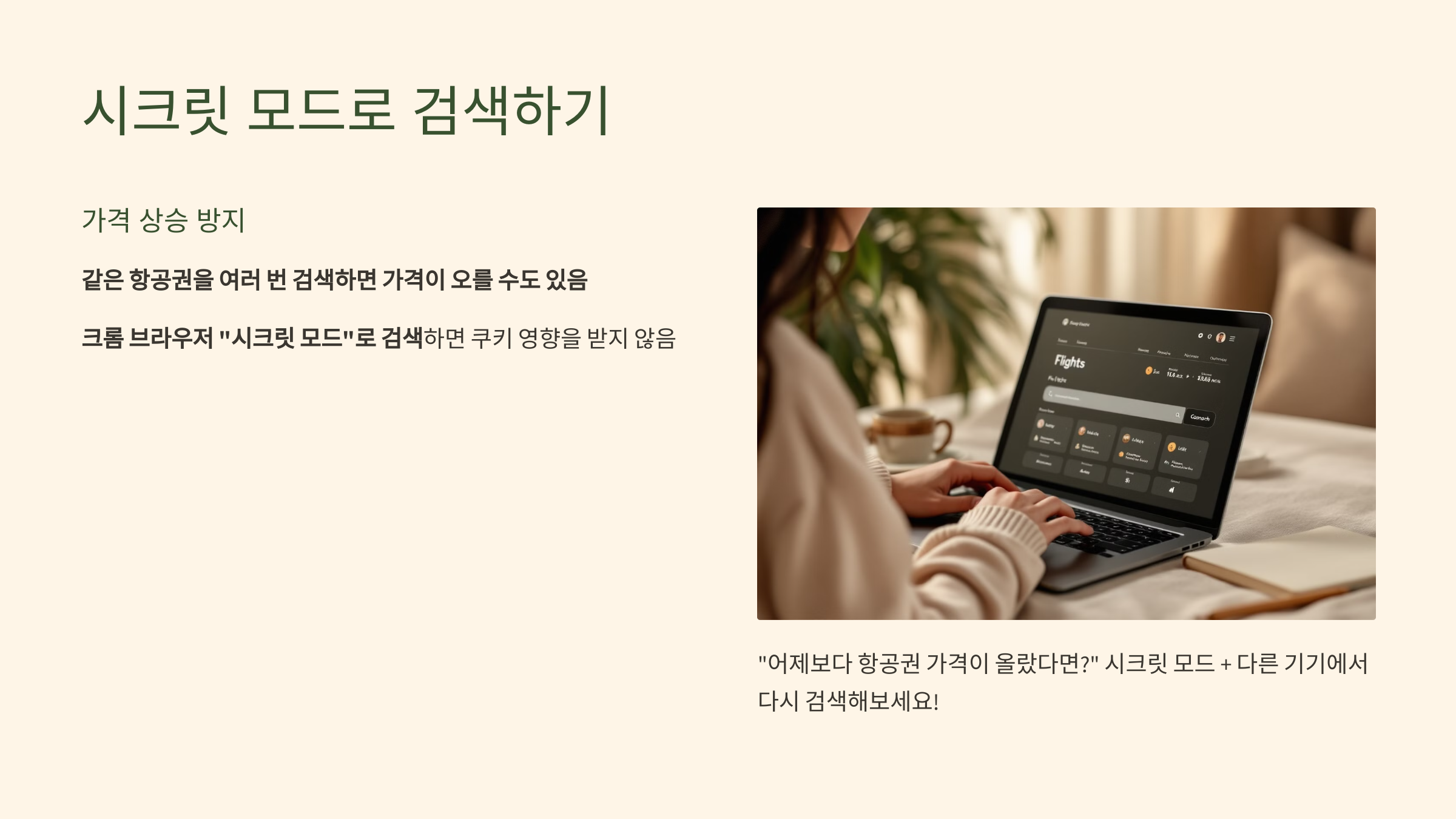 👉 "어제보다 항공권 가격이 올랐다면?" 시크릿 모드 + 다른 기기에서 다시 검색해보세요!