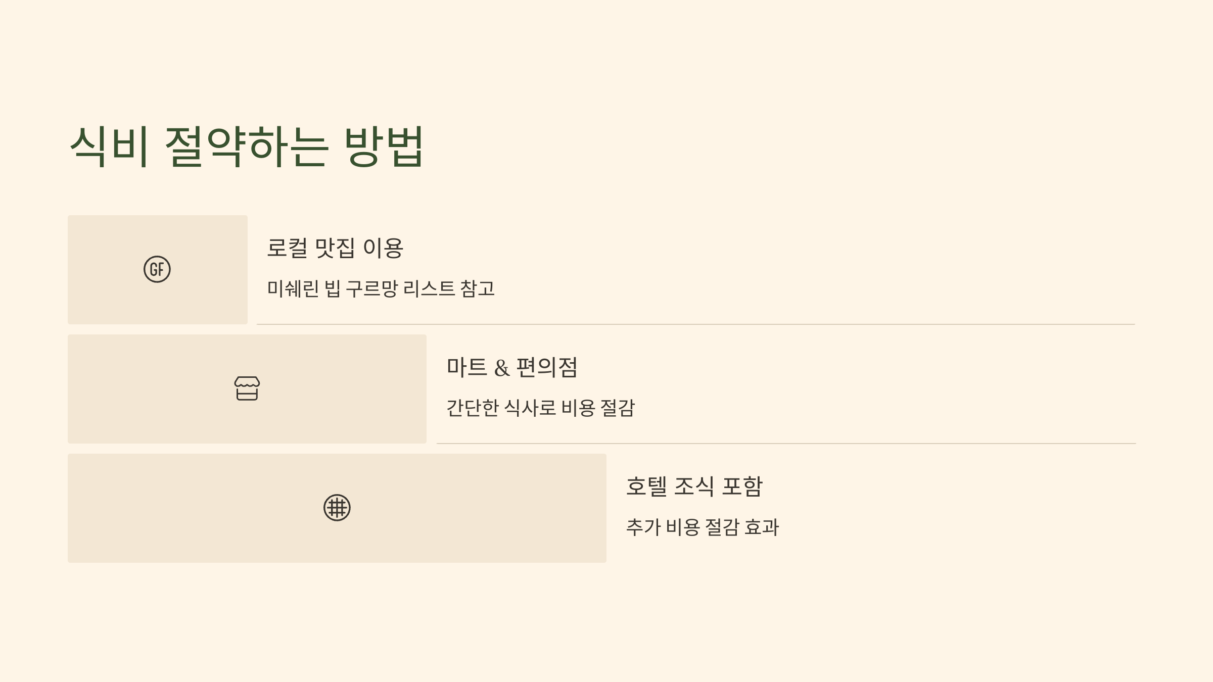 🔲 식비 절감 전략 (로컬 맛집 & 마트 활용)