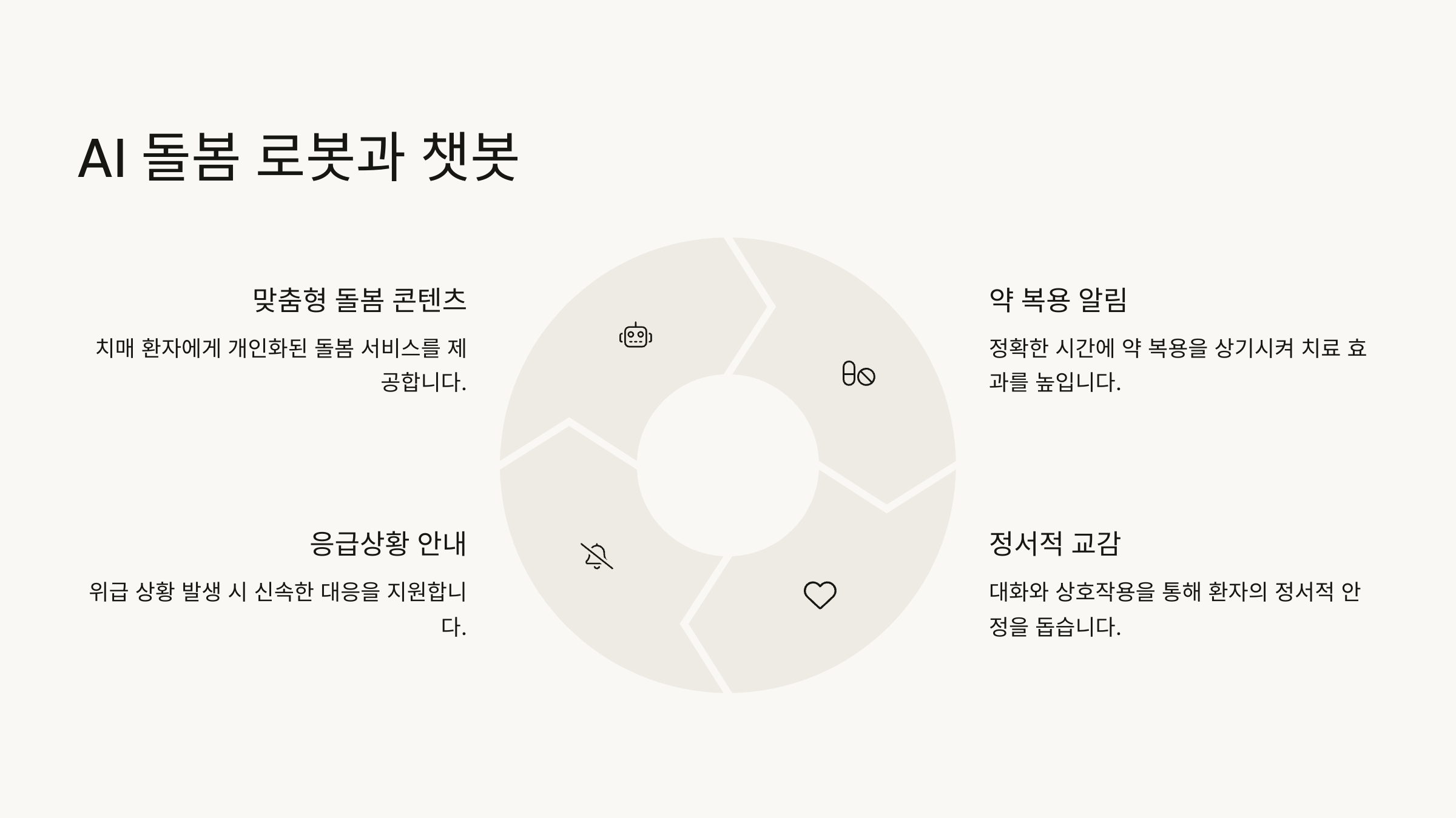 - 인공지능 돌봄 로봇은 치매 환자에게 맞춤형 돌봄 콘텐츠, 약 복용 알림, 응급상황 안내, 정서적 교감 등 다양한 서비스를 제공합니다. 실제로 광주 서구에서는 AI 돌봄 로봇과 AI 스피커, ICT 웨어러블 디바이스를 활용한 통합 돌봄케어 모델이 구축되어 치매 환자와 독거노인의 삶의 질을 높이고 있습니다.