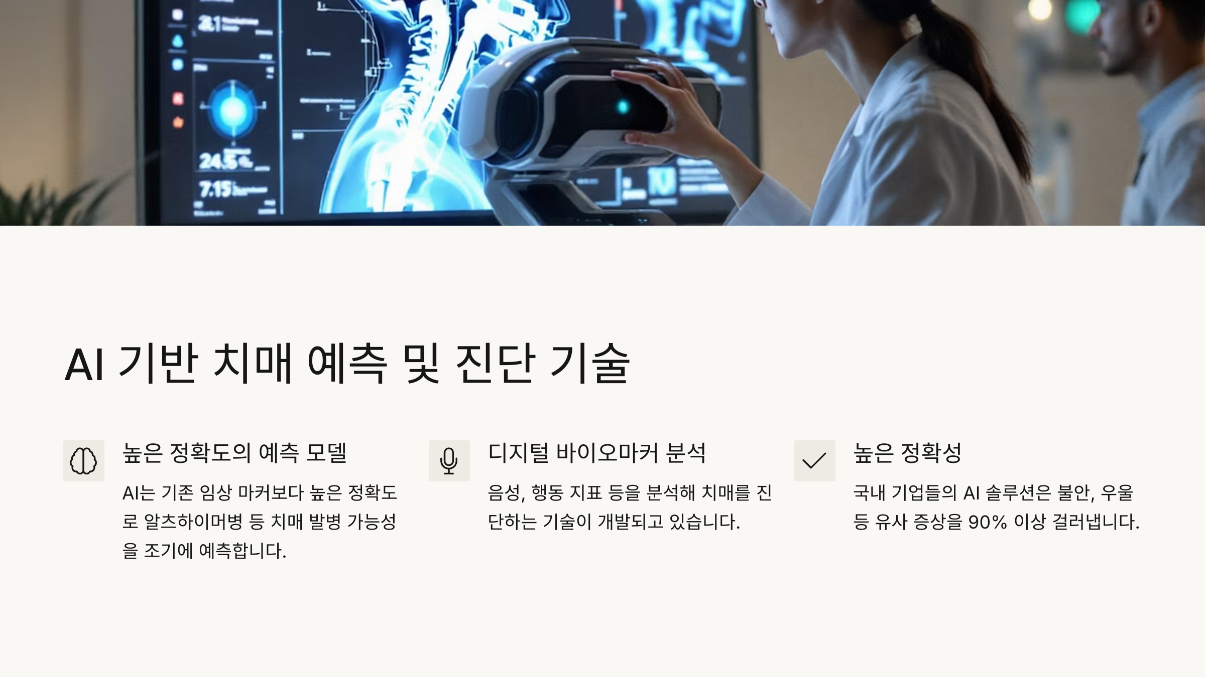 - 예를 들어, 하이와 바이칼에이아이 등 국내 디지털 헬스케어 기업들이 AI 기반 치매 진단 솔루션을 제공하고 있습니다. 이 기술들은 치매가 아닌 불안, 우울 등 유사 증상을 90% 이상 걸러내는 등 진단의 정확성을 크게 높이고 있습니다.