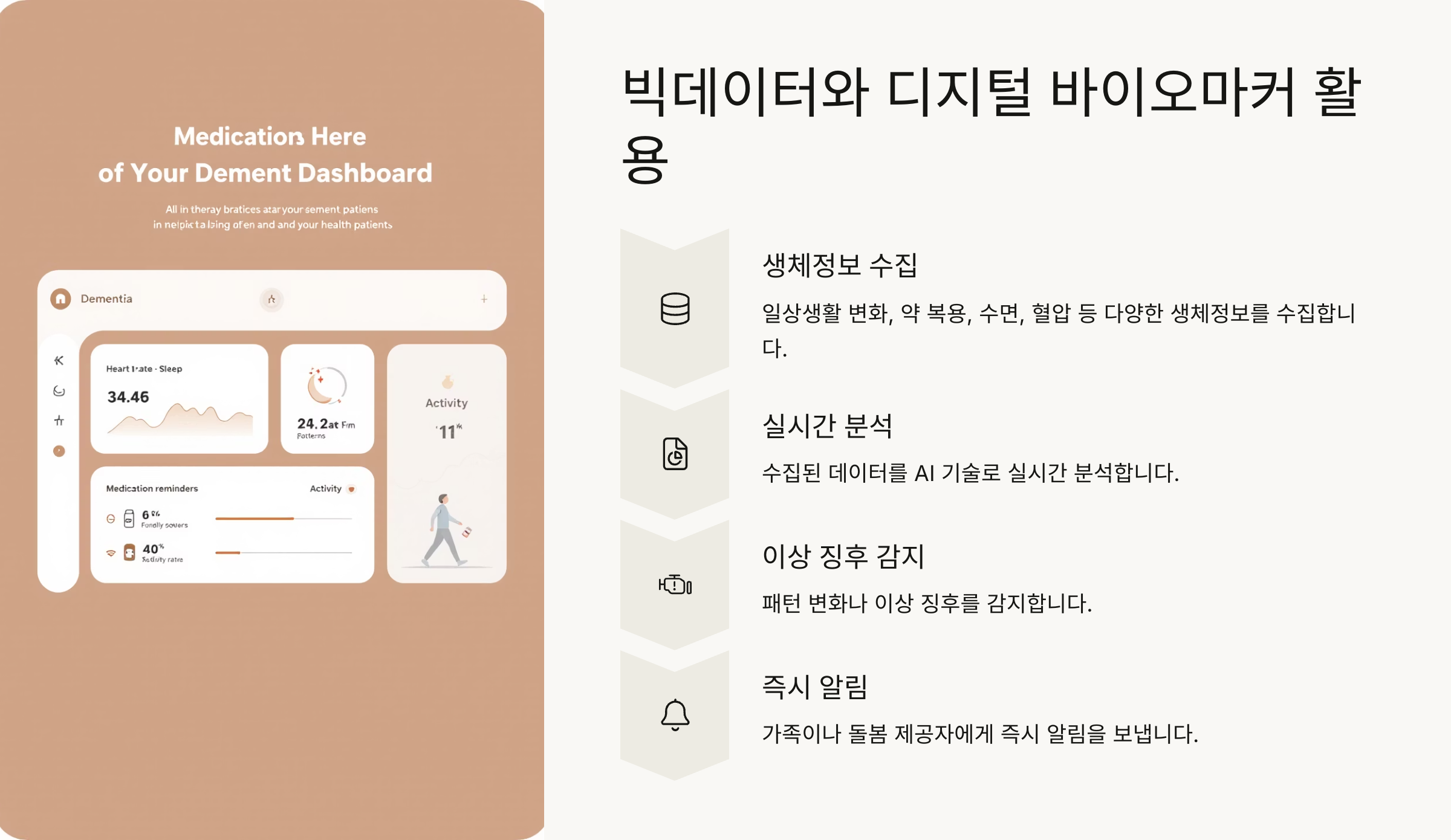 - 빅데이터와 디지털 바이오마커를 활용해 치매 환자의 일상생활 변화, 약 복용, 수면, 혈압 등 다양한 생체정보를 실시간으로 분석합니다. 이상 징후가 발견되면 가족이나 돌봄 제공자에게 즉시 알림을 보내 사전 예방과 조기 대응이 가능해졌습니다.