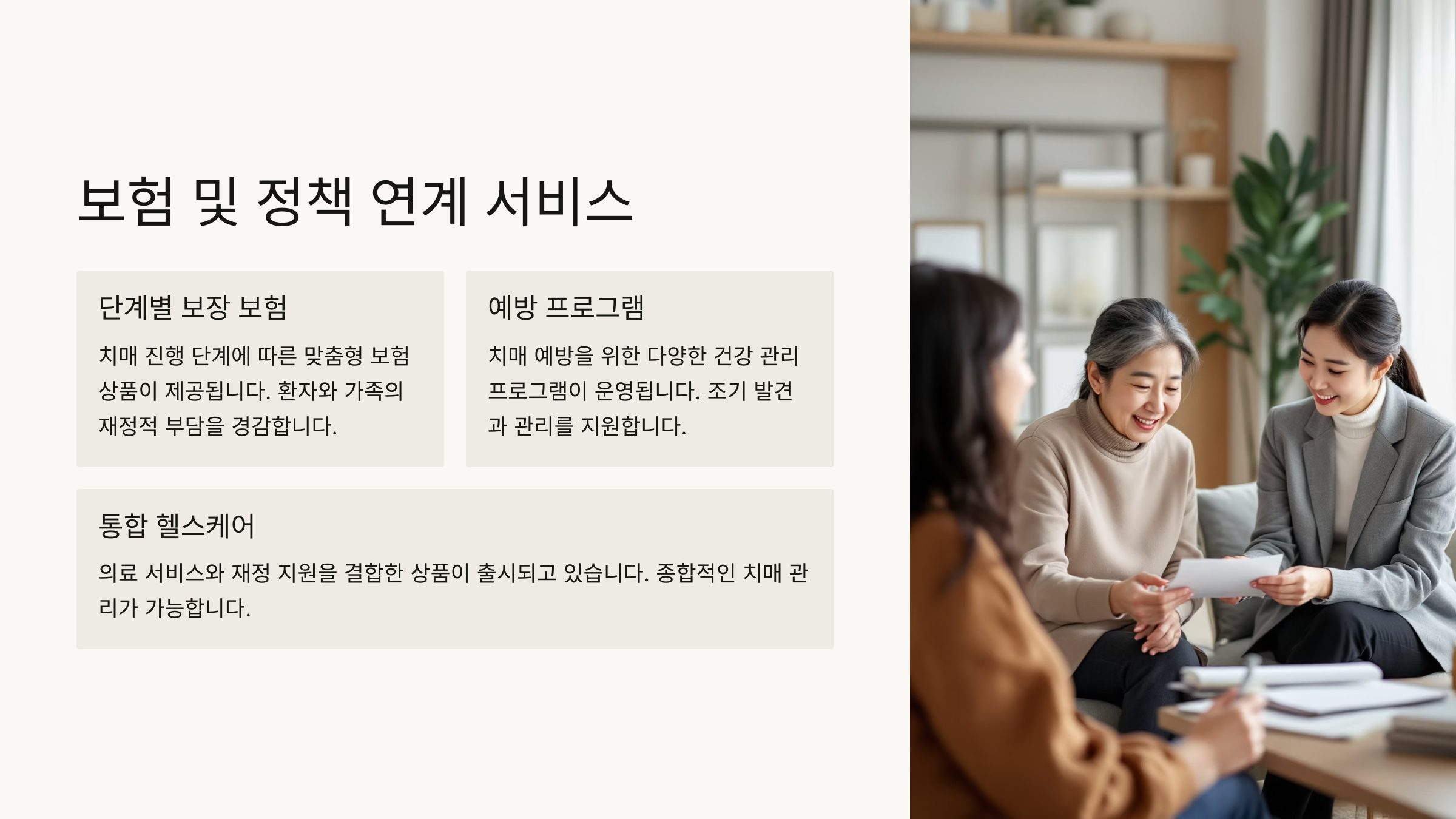 - 생명보험 업계에서는 치매 단계별 보장 보험상품, 치매 예방 프로그램 등 다양한 헬스케어 서비스와 재정 지원을 결합한 상품을 출시해 치매 환자와 가족의 부담을 덜고 있습니다.