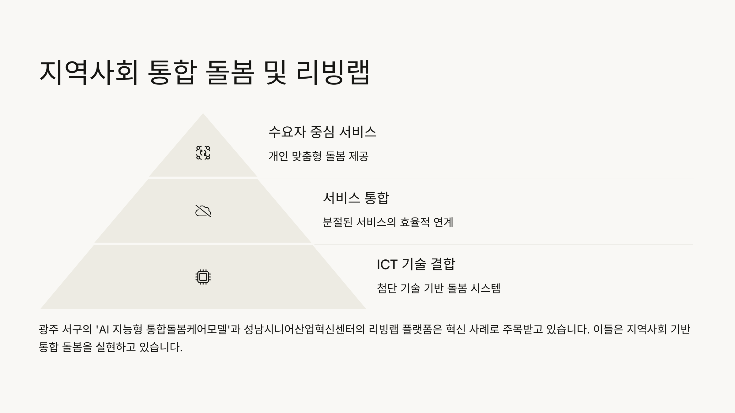 - 광주 서구의 ‘AI 지능형 통합돌봄케어모델’과 성남시니어산업혁신센터의 리빙랩 플랫폼 등은 ICT 기술을 지역사회 돌봄에 결합해, 분절된 서비스를 통합하고 수요자 중심의 맞춤형 서비스를 제공하는 혁신 사례로 주목받고 있습니다.