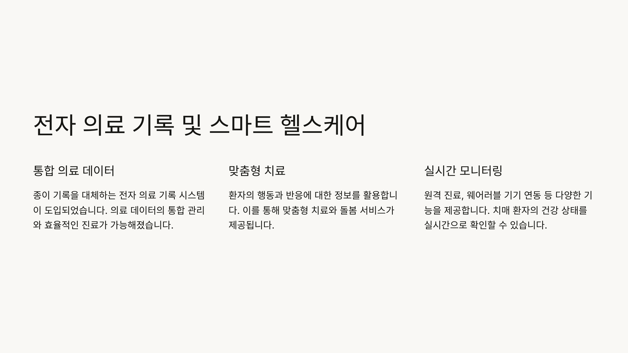 - 종이 기록을 대체하는 전자 의료 기록 시스템이 도입되어 의료 데이터의 통합 관리와 효율적인 진료가 가능해졌습니다. 환자의 행동과 반응에 대한 정보를 활용해 맞춤형 치료와 돌봄 서비스가 제공되고 있습니다.