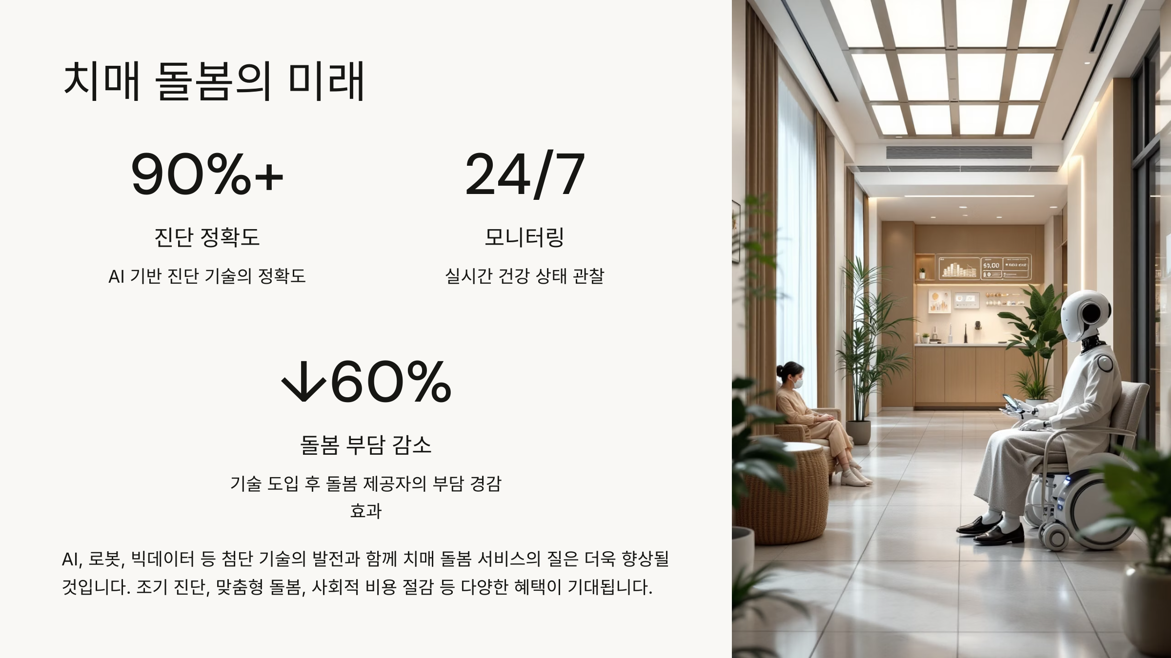 이러한 기술 혁신들은 치매의 조기 진단과 예방, 환자 맞춤형 돌봄, 돌봄 노동자의 부담 경감, 사회적 비용 절감 등 다양한 측면에서 치매 돌봄의 패러다임을 변화시키고 있습니다. 앞으로도 AI, 로봇, 빅데이터 등 첨단 기술의 발전과 더불어 치매 돌봄 서비스의 질은 더욱 향상될 것으로 기대됩니다.