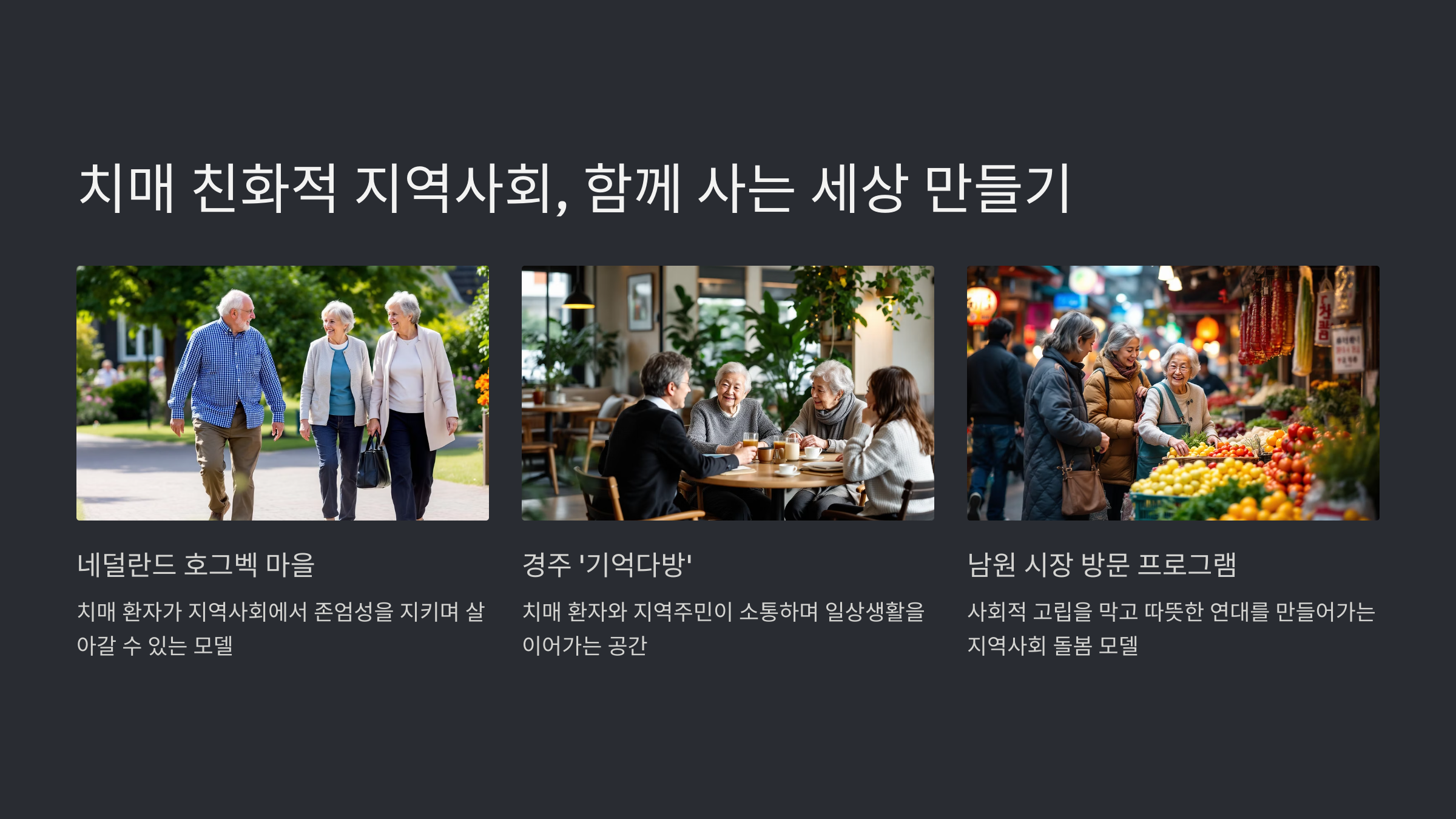네덜란드 호그벡 마을, 프랑스 랑드 알츠하이머마을처럼, 치매 환자가 지역사회에서 존엄성을 지키며 살아갈 수 있도록 지원하는 모델이 주목받고 있습니다.