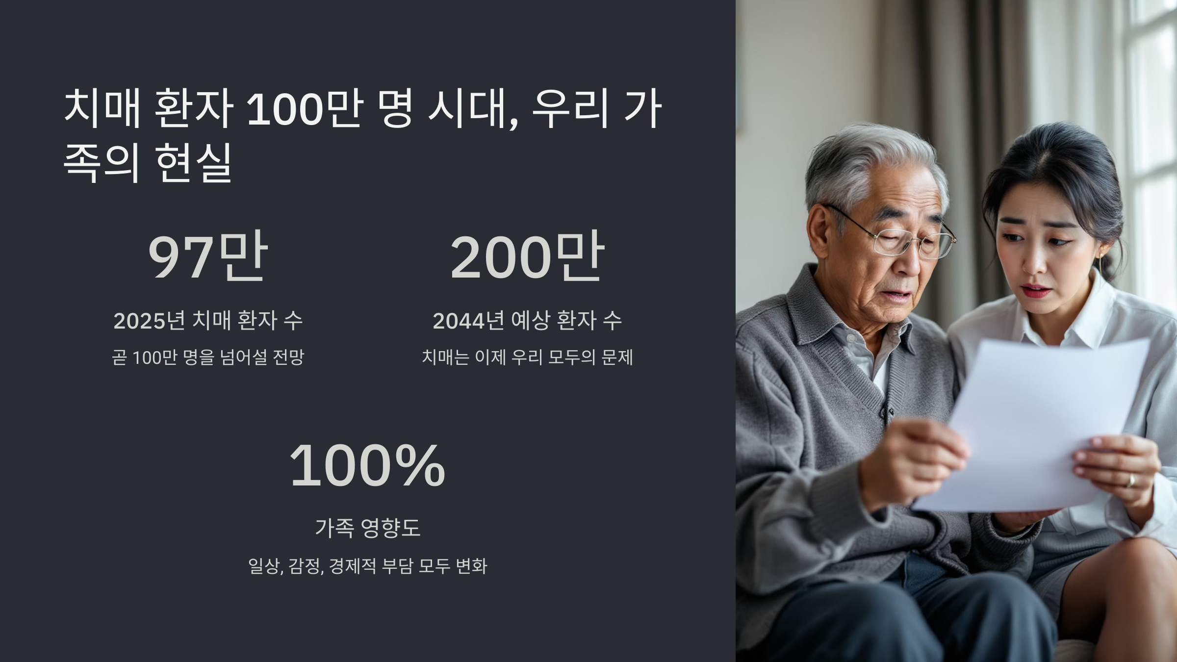 2025년 대한민국의 치매 환자 수는 97만 명, 곧 100만 명을 넘어설 전망입니다.