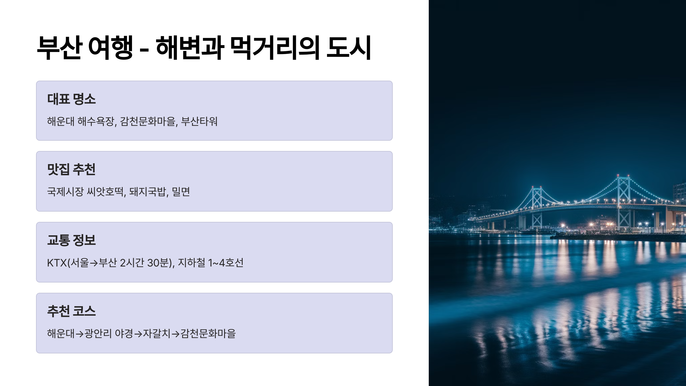 3. 부산 여행 가이드 – 바다와 먹거리가 가득한 도시