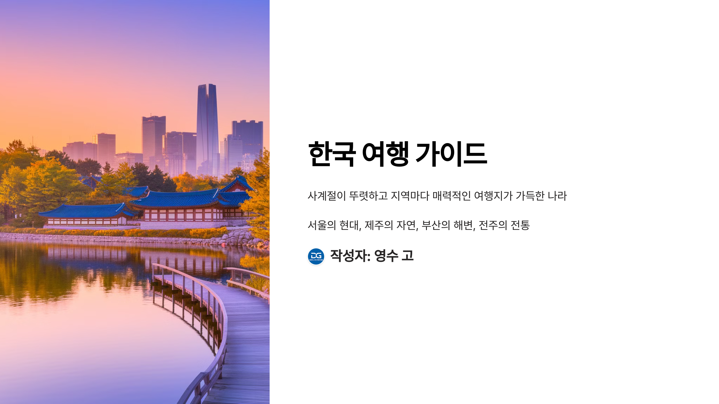 한국은 사계절이 뚜렷하고, 지역마다 매력적인 여행지가 가득한 나라입니다. 서울의 현대적인 분위기, 제주도의 아름다운 자연, 부산의 해변과 먹거리 등 다양한 경험을 할 수 있습니다.