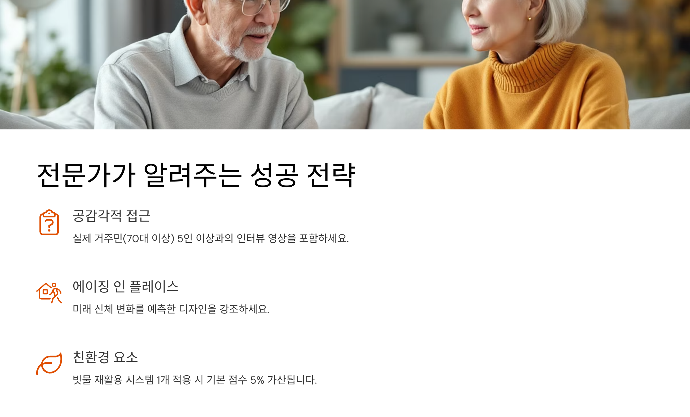 - “공감각적 접근”이 핵심! 실제 거주민(70대 이상) 5인 이상과의 인터뷰 영상을 포함하세요.